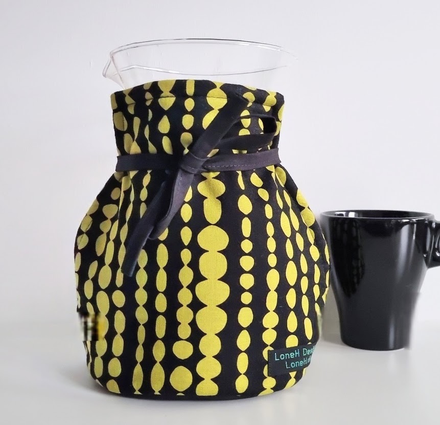 Den er håndsyet i et unikt stofdesign, hvor de grafiske grønne mønstre står smukt mod den sorte baggrund. Den praktiske snøre sikrer, at tasken sidder tæt om bryggeren, så varmen bliver inde, mens du nyder duften af friskbrygget kaffe.