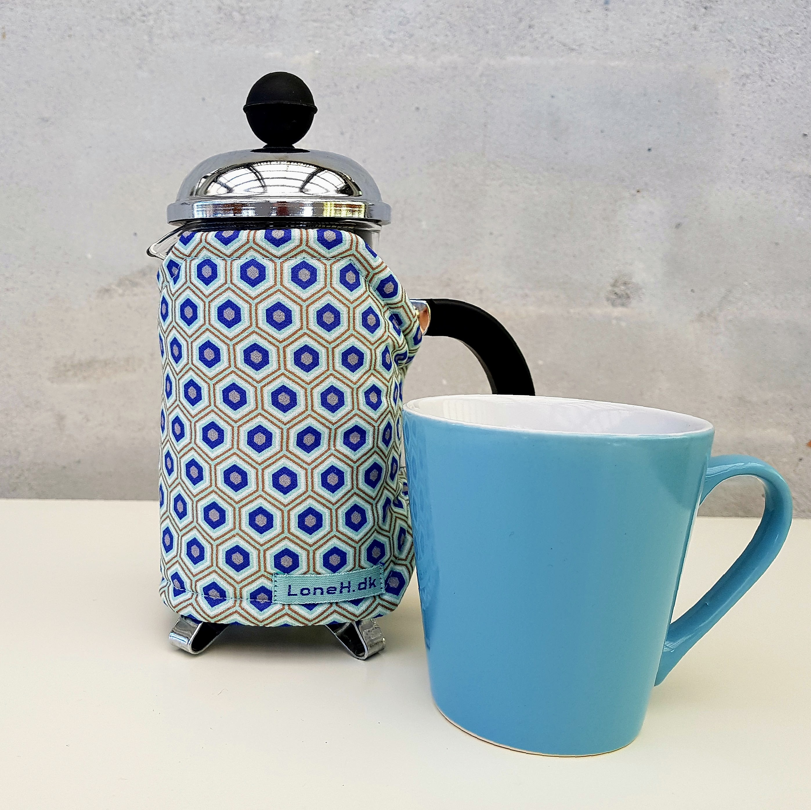 Kaffevarmeren er i flotte blå nuancer og er isoleret med grillfoer, så kaffen holder sig dejlig varm.
