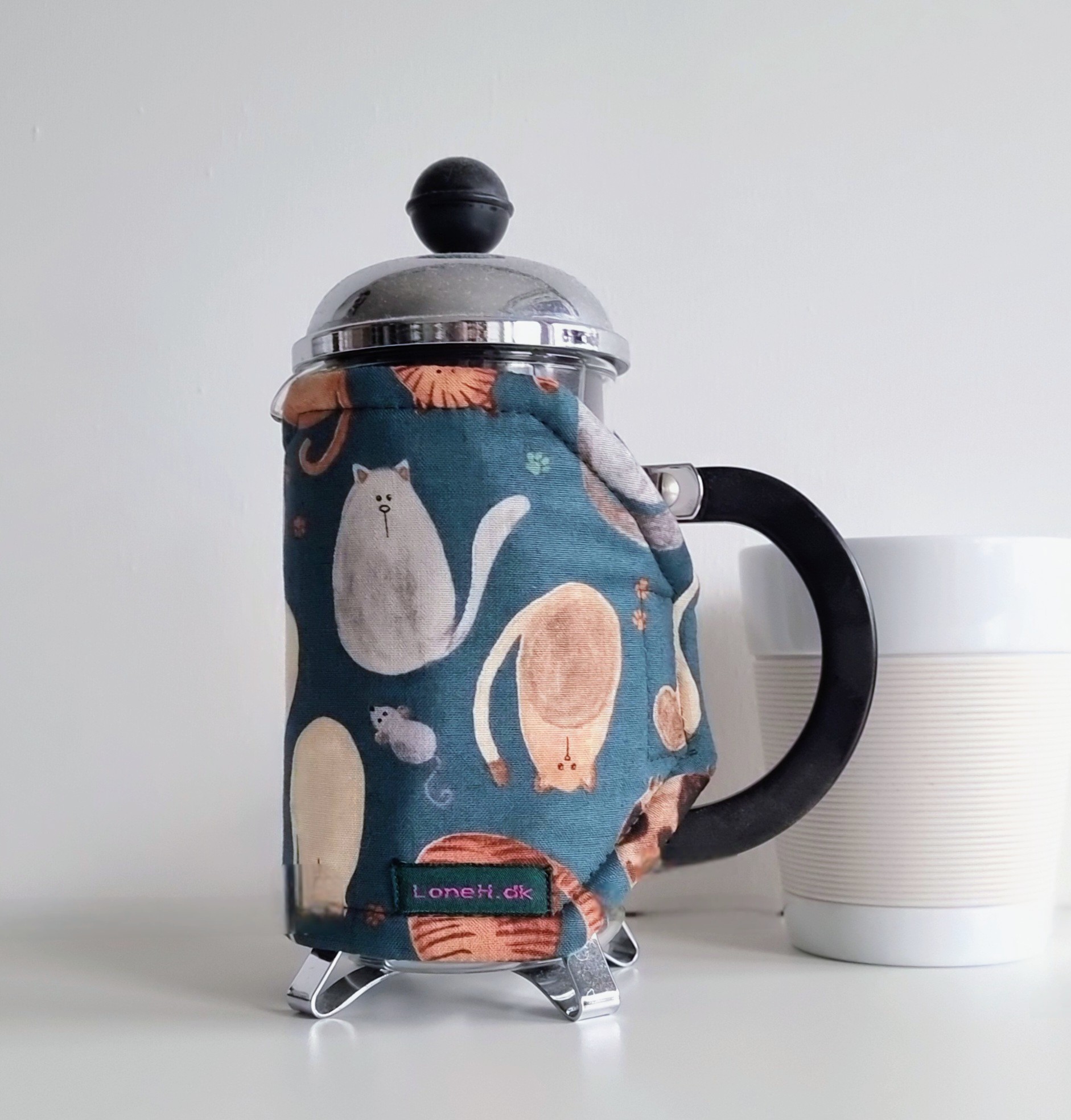 Håndlavet Kaffevarmer med Kattemotiv – til Stempelkande på 2 Kopper