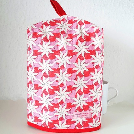 Kaffehætten er syet i røde og lyserøde nuancer med et diskret mønster af hvide liljer, som giver et feminint og moderne udtryk. Den kombinerer funktionalitet med det stilrene og passer smukt ind i både klassiske og moderne køkkener.
