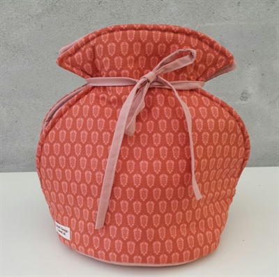 Tetaske i rustfarvet - minder om paprika - med små blade. Når tepotten er sat ned i tetasken og båndet er snøret, er det nemt at hælde teen op og have potten med sig rundt.