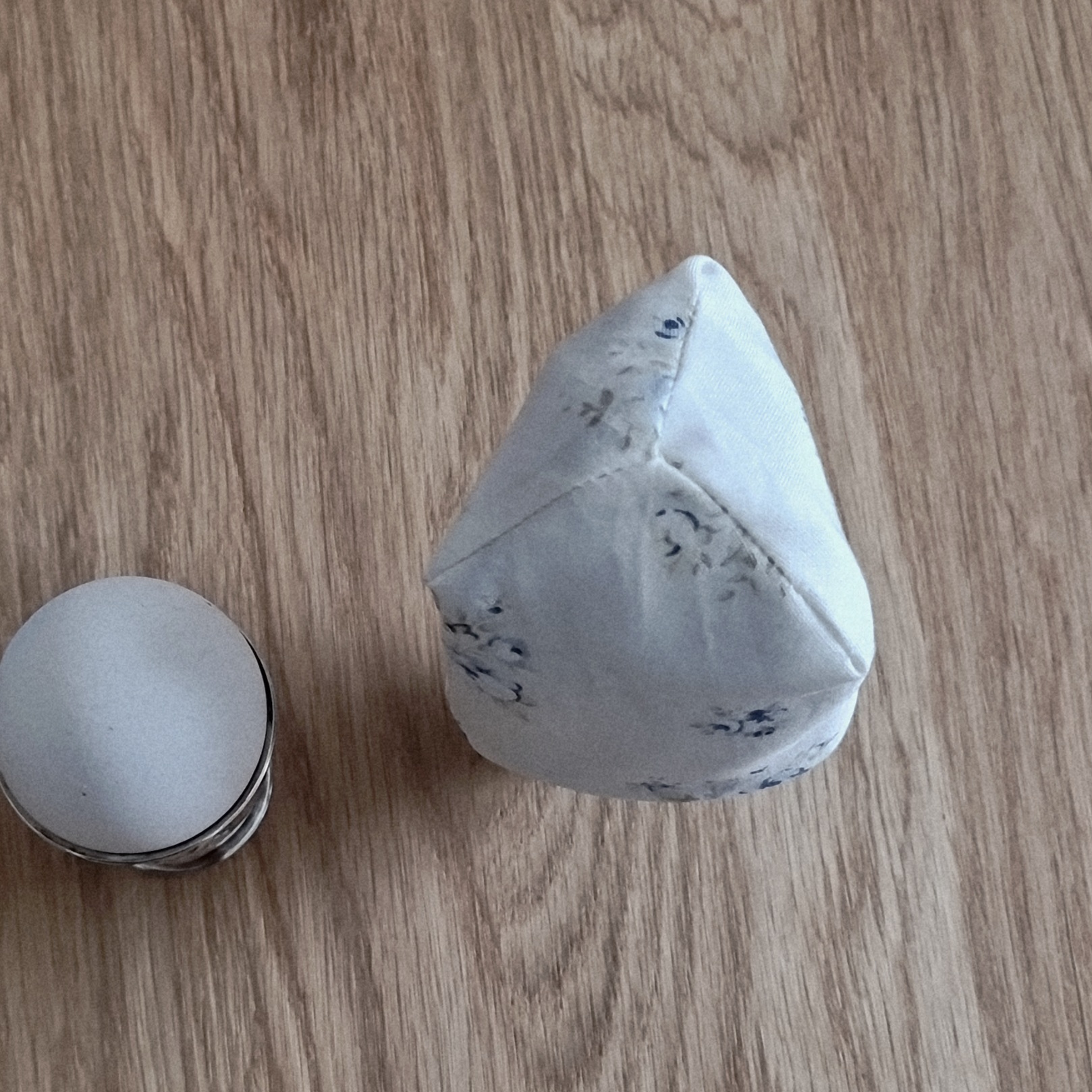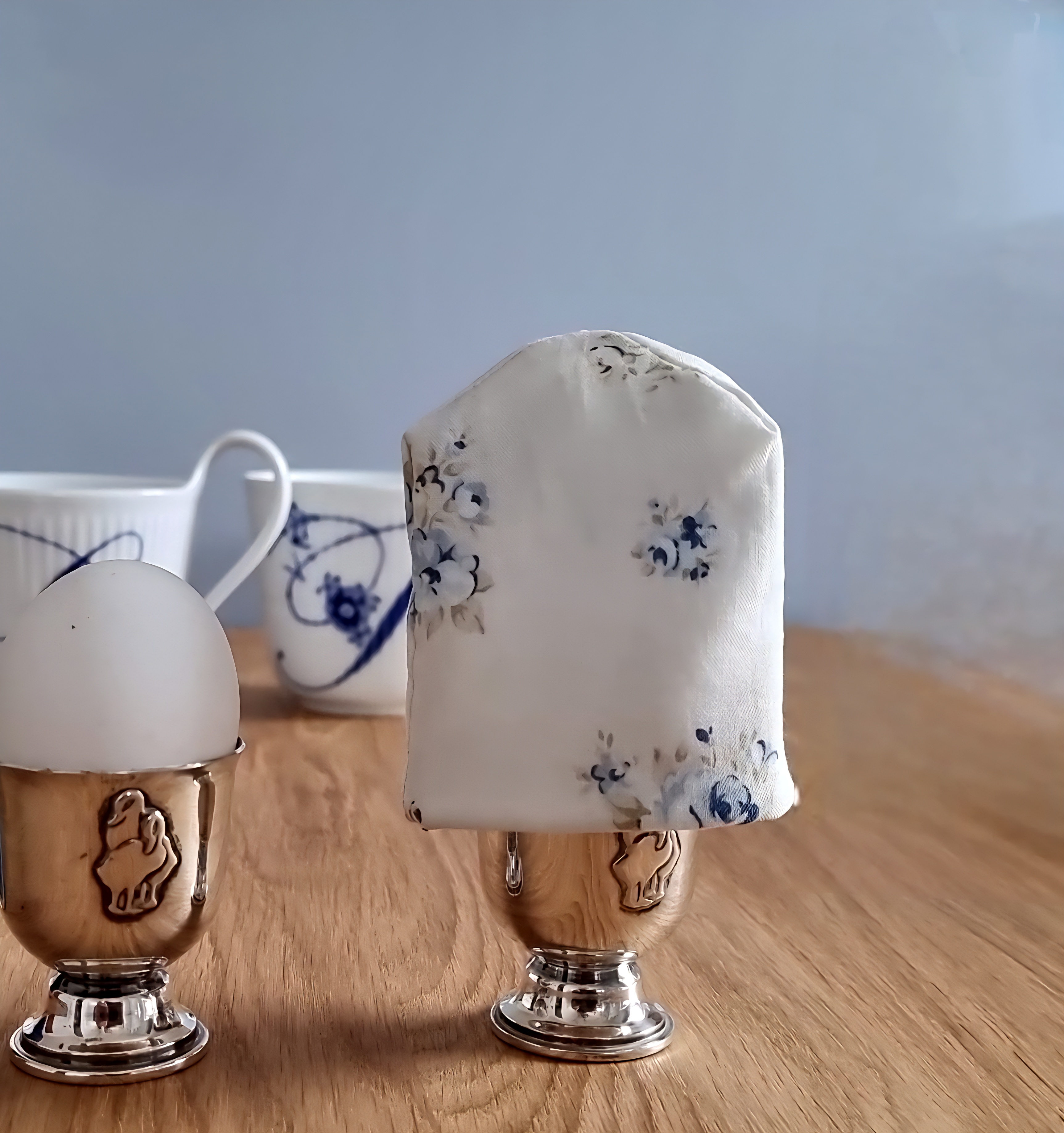 Æggevarmeren - der passer bedst til æg fra fritgående høns - er hvid med blå blomster.